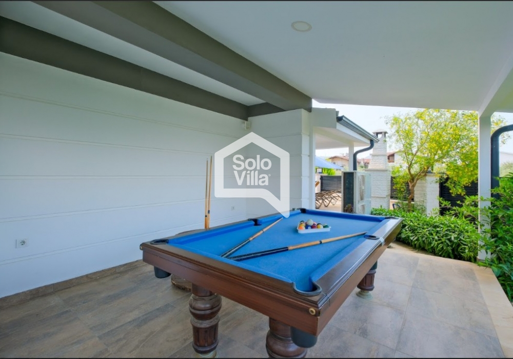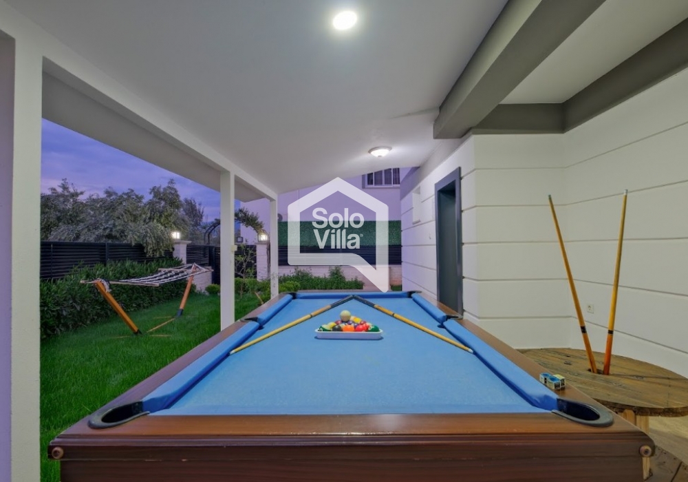 Genießen Sie den privaten Swimmingpool den ganzen Tag über und bereiten Sie köstliche Mahlzeiten im Grillbereich im großen Garten zu. Zudem sorgen Billardtisch, Dart und ein Mini-Fußballfeld im Garten für Unterhaltung.