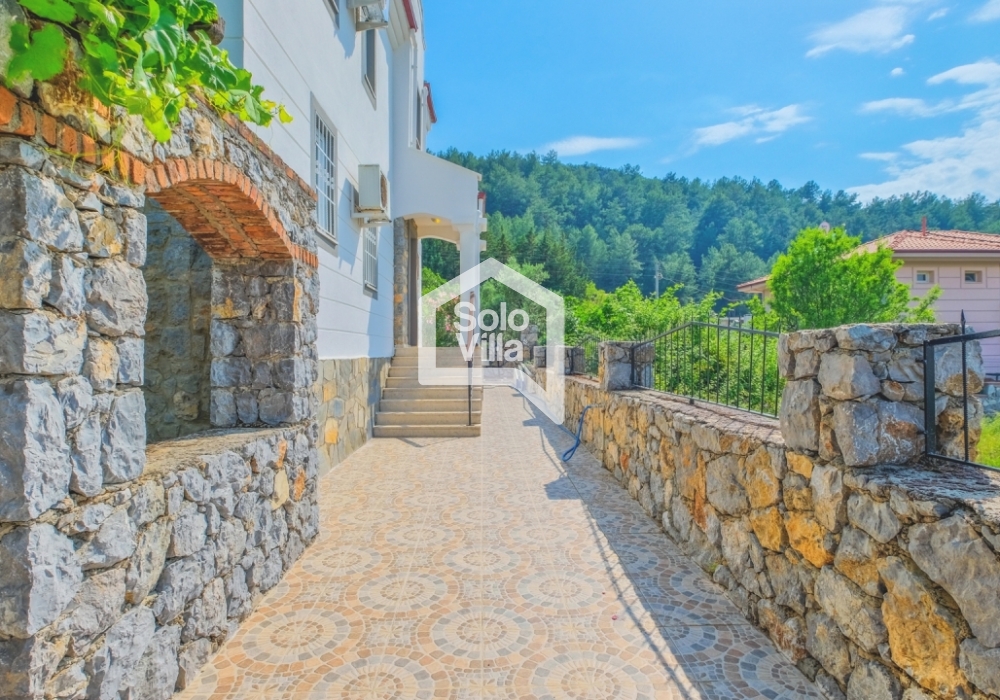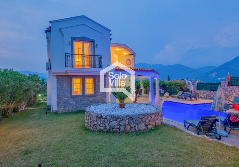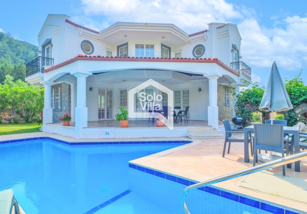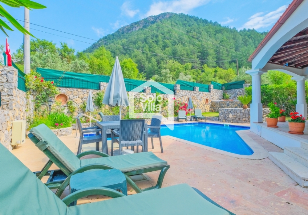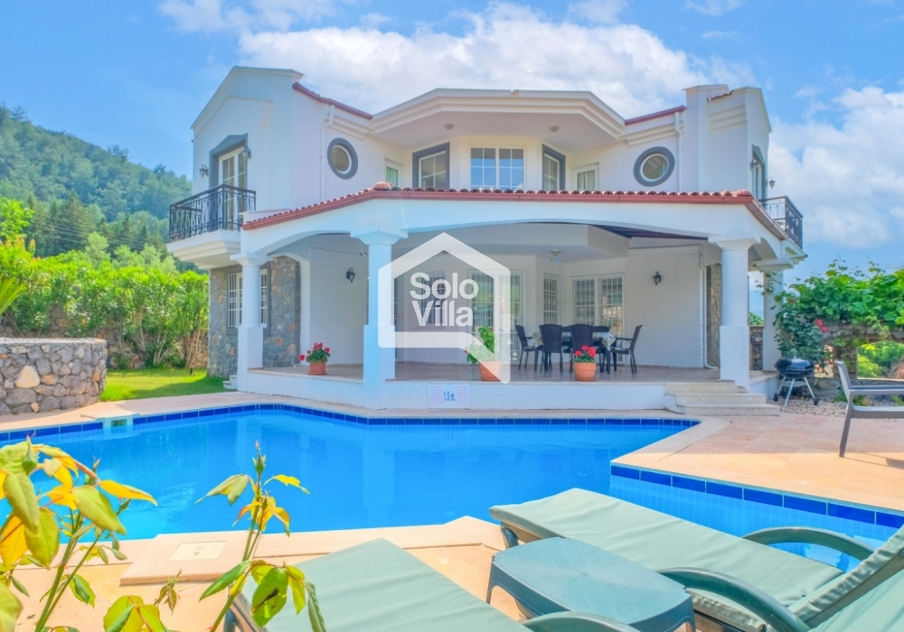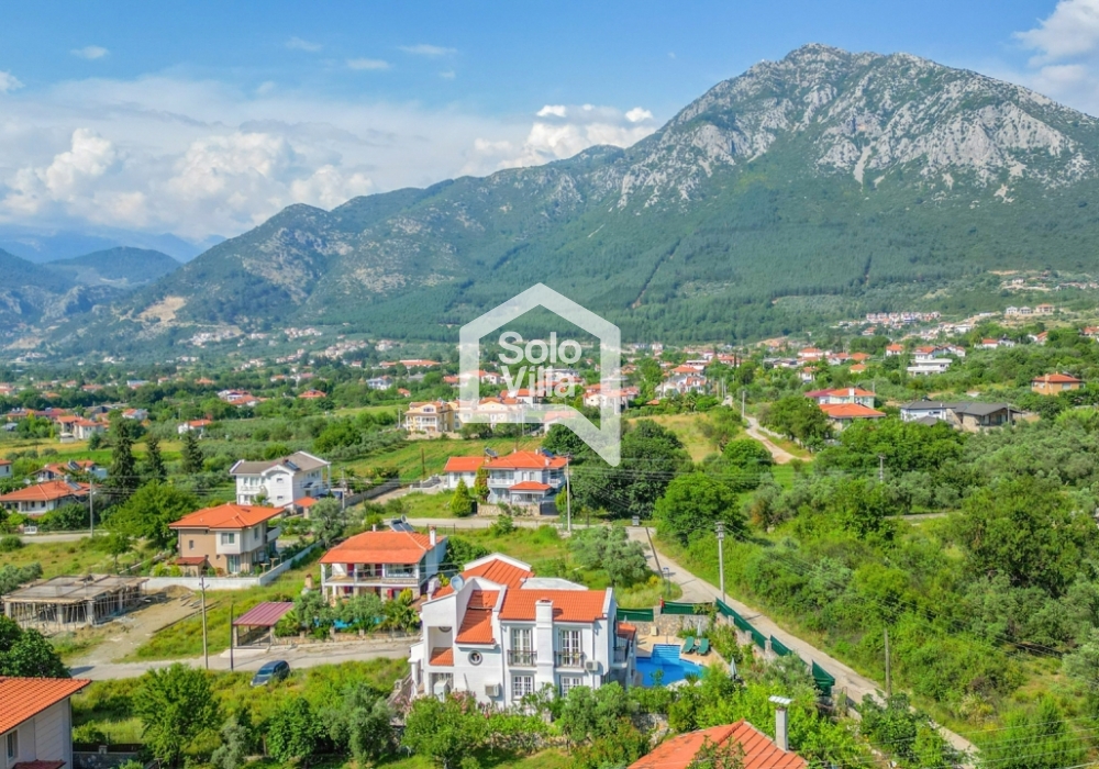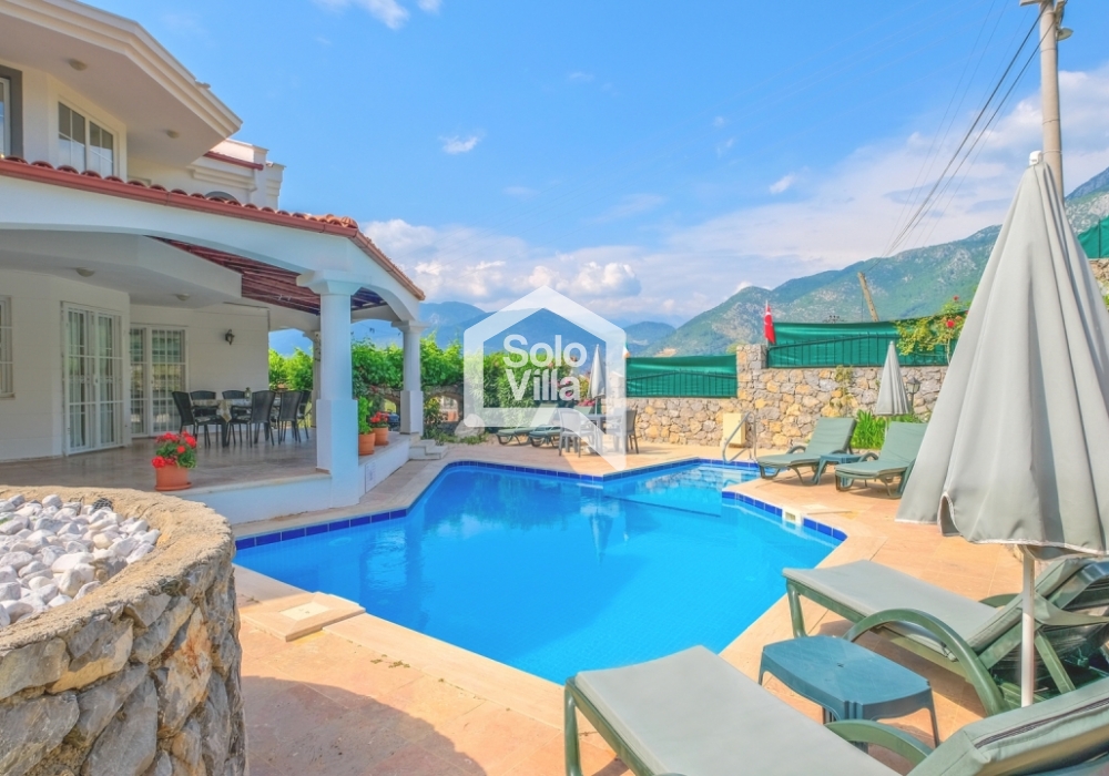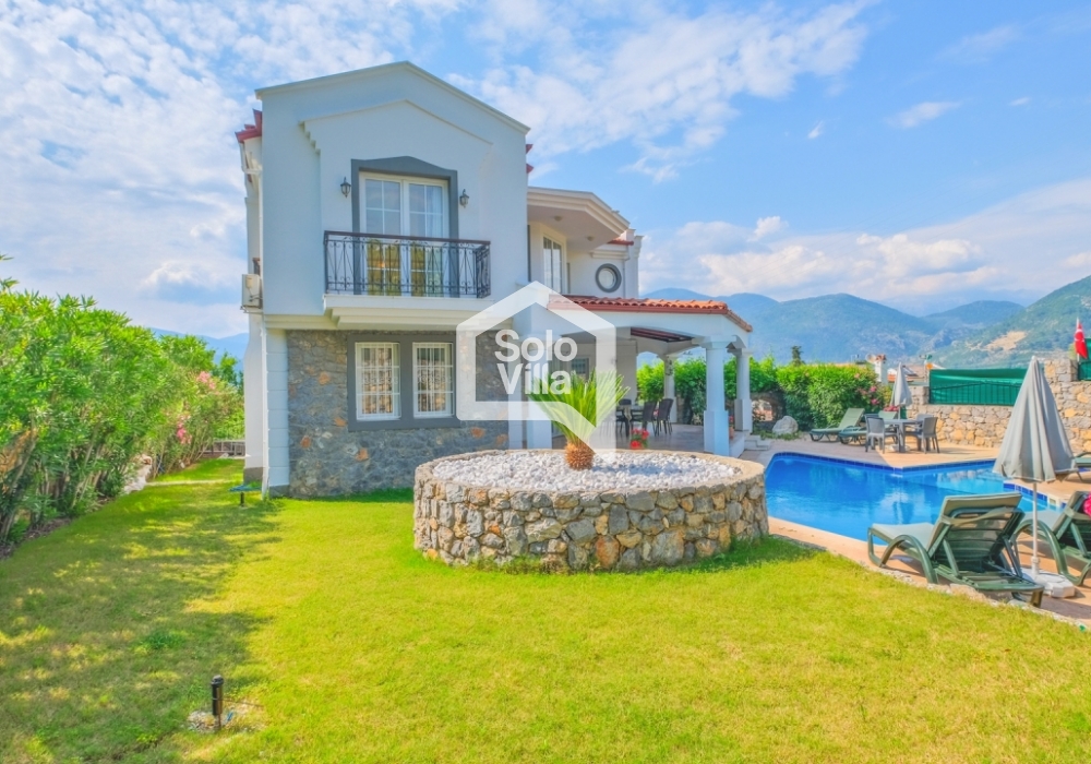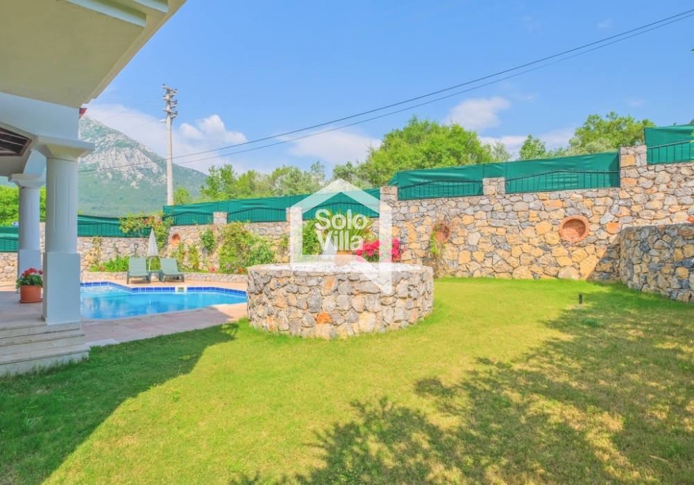This charming and spacious three-bedroom villa is ideal for those looking to relax and enjoy the natural beauty of the surroundings, away from the hustle and bustle. Perfect for guests seeking peace and privacy, the villa features a modern and comfortable living room that opens onto a dining terrace, a fully equipped separate kitchen, three bedrooms (one of which is an en-suite), one en-suite bathroom, two shared bathrooms, a sun terrace, a private (non-heated) swimming pool, a landscaped garden, and a barbecue area. The villa is just a few minutes from the village center, where you can find restaurants and shops. Calis Beach and Fethiye city center are a 17-minute drive away, and the world-famous Oludeniz Beach is located 30 minutes away by car.