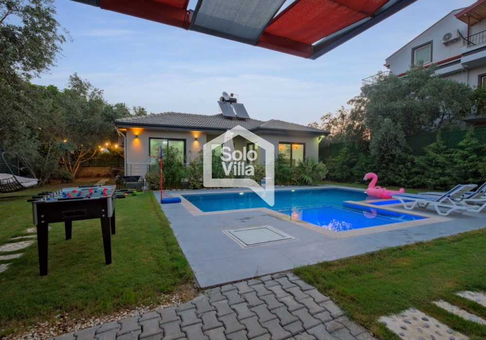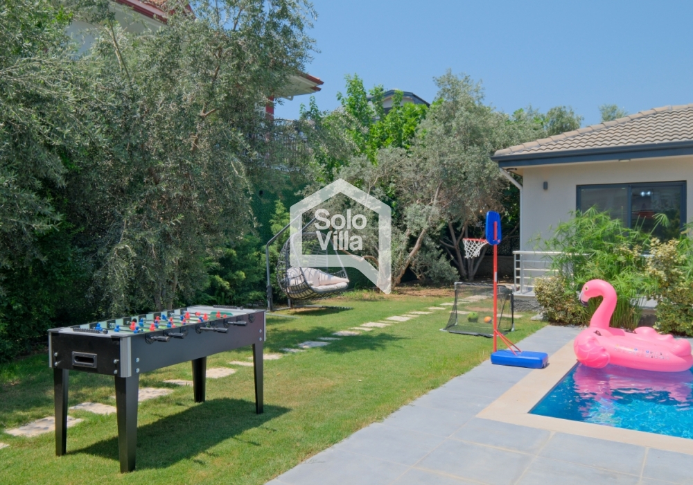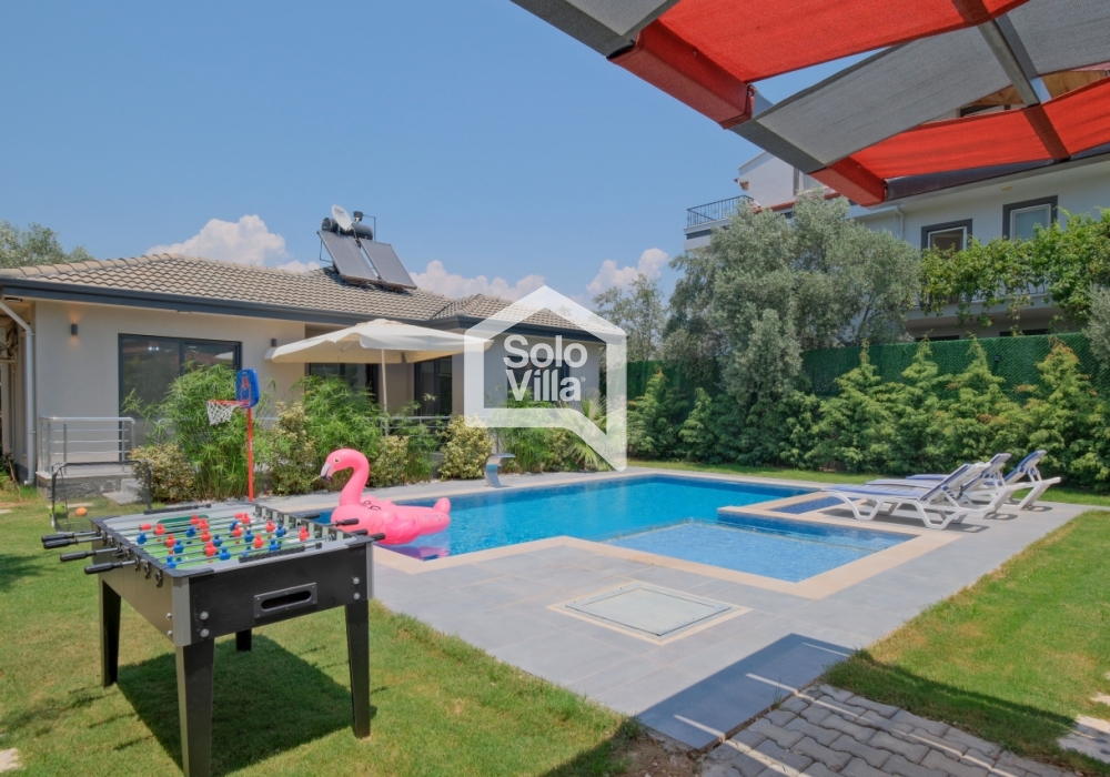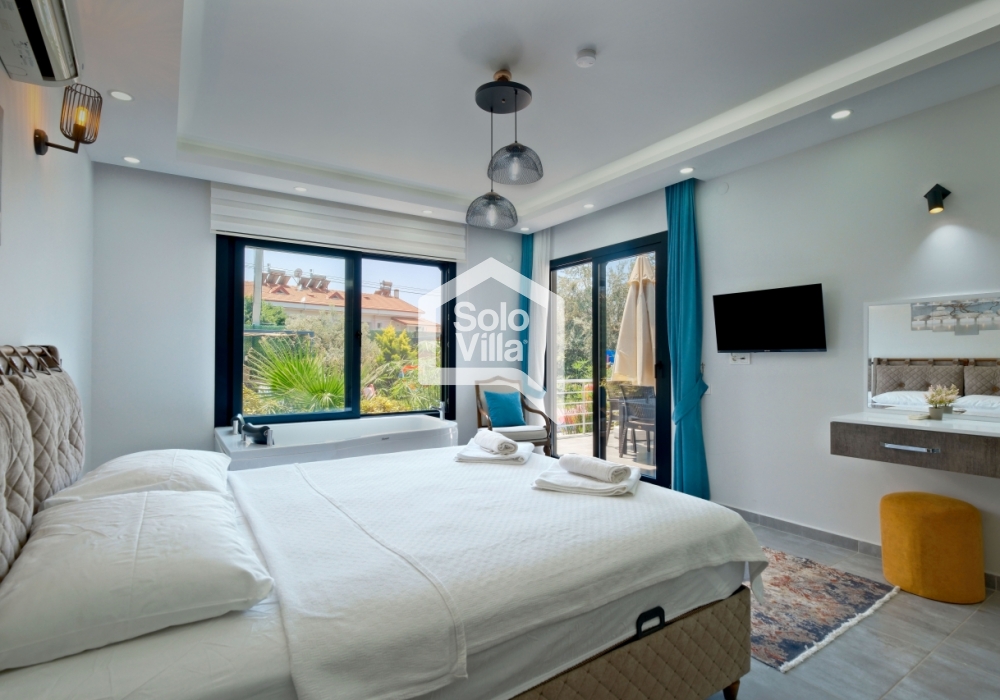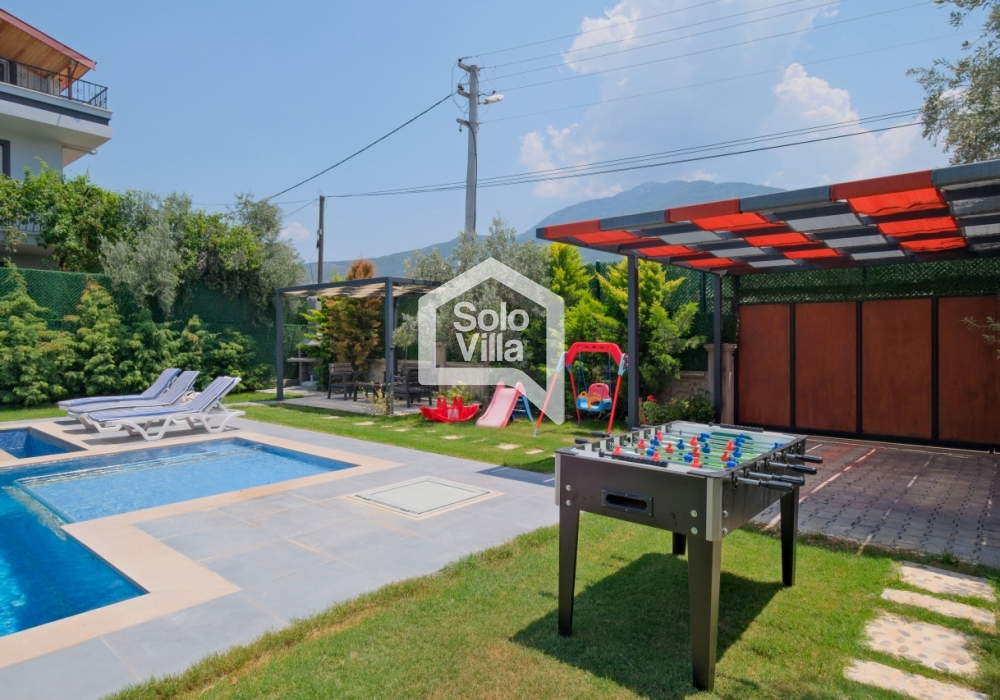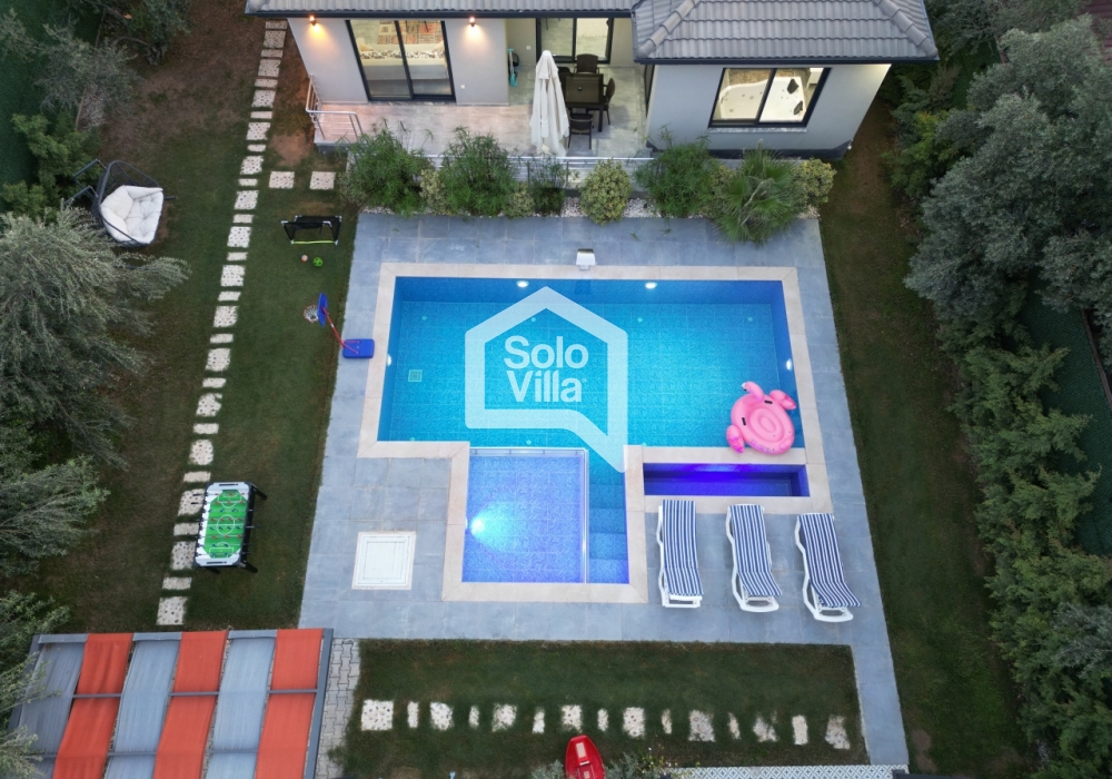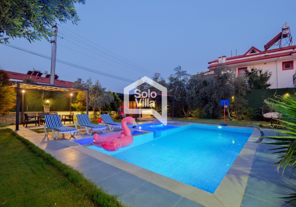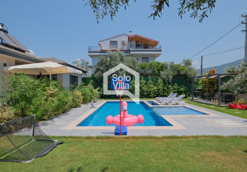 Located in a serene, nature-filled area of Fethiye, Villa Solo Tanus offers 2 bedrooms and accommodation for up to 4 guests, making it perfect for families and small groups. Enjoy the private pool, children’s pool, and garden entertainment areas (table tennis, foosball, air hockey) for a fun-filled holiday. The master bedroom jacuzzi and sauna, along with a modern kitchen and spacious living areas, combine comfort and luxury.