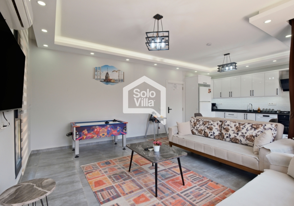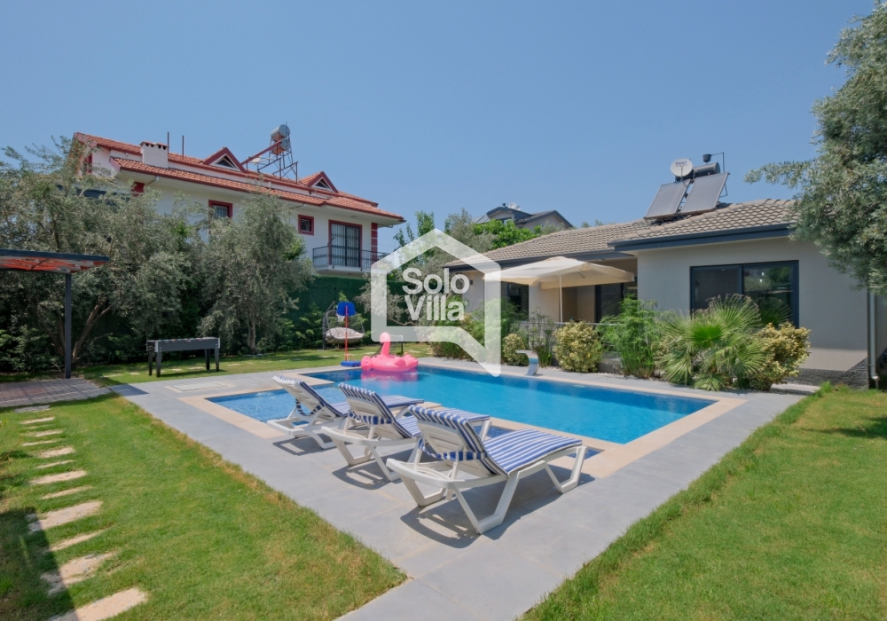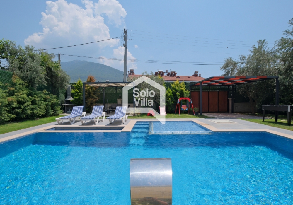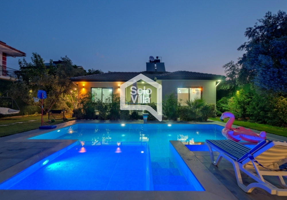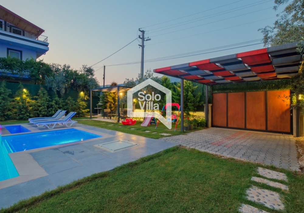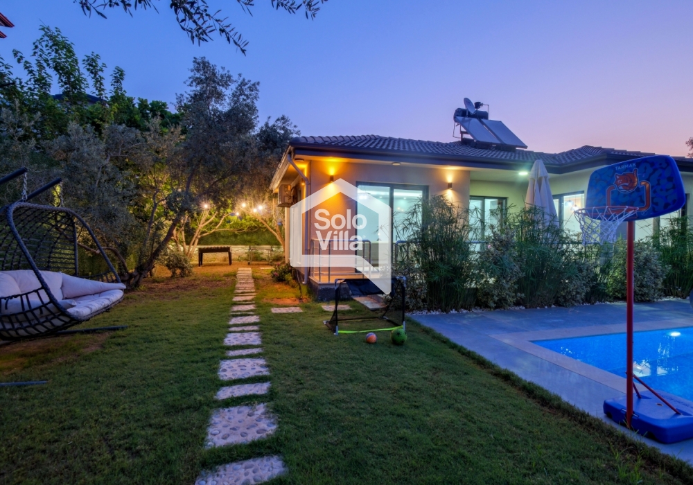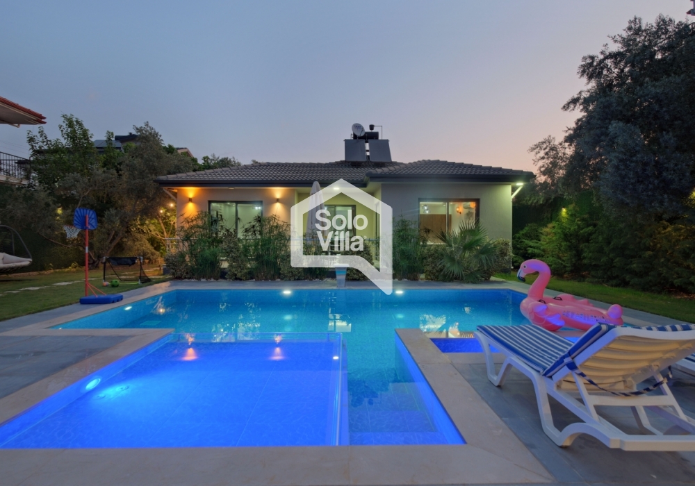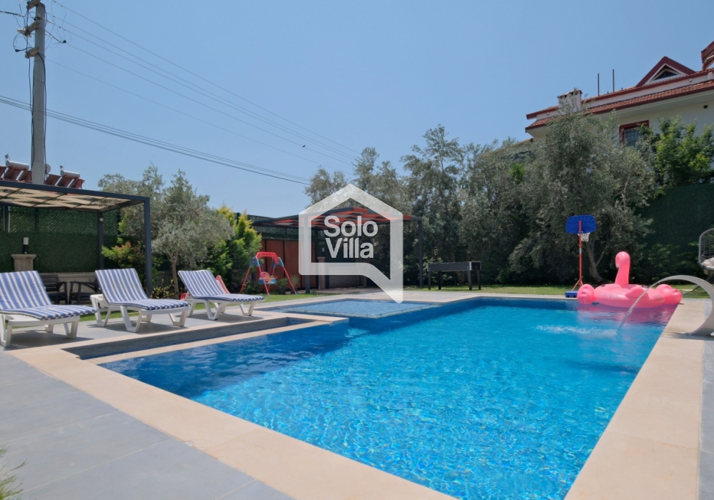 Located in a serene, nature-filled area of Fethiye, Villa Solo Tanus offers 2 bedrooms and accommodation for up to 4 guests, making it perfect for families and small groups. Enjoy the private pool, children’s pool, and garden entertainment areas (table tennis, foosball, air hockey) for a fun-filled holiday. The master bedroom jacuzzi and sauna, along with a modern kitchen and spacious living areas, combine comfort and luxury.