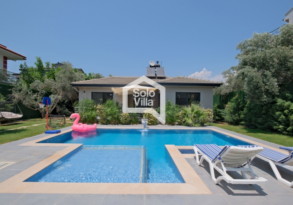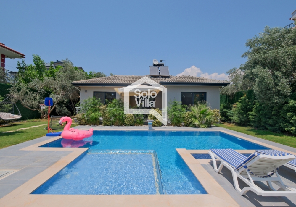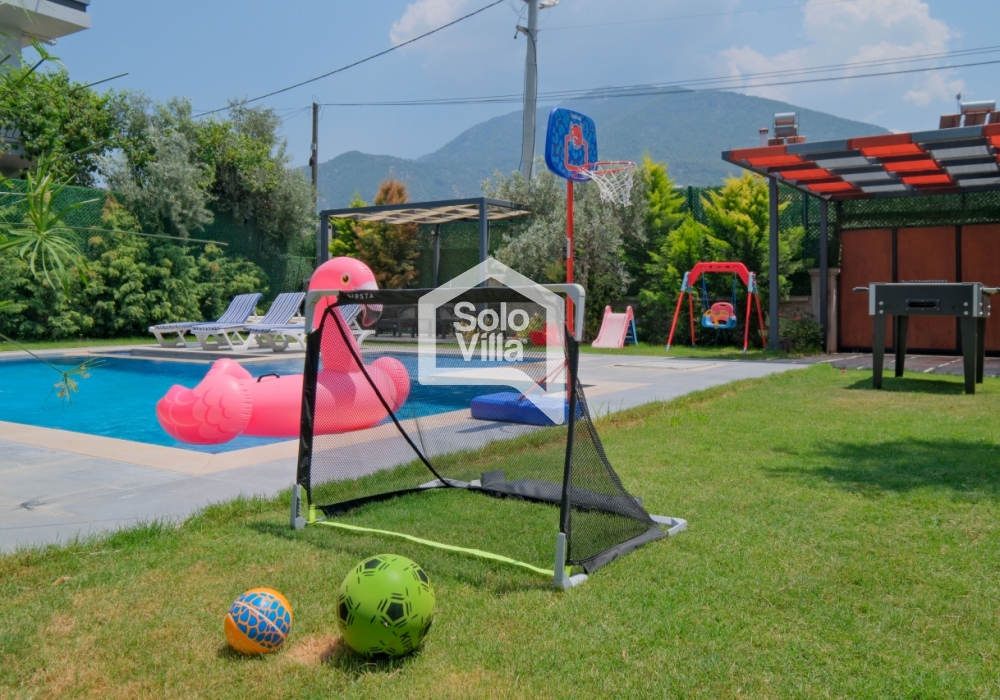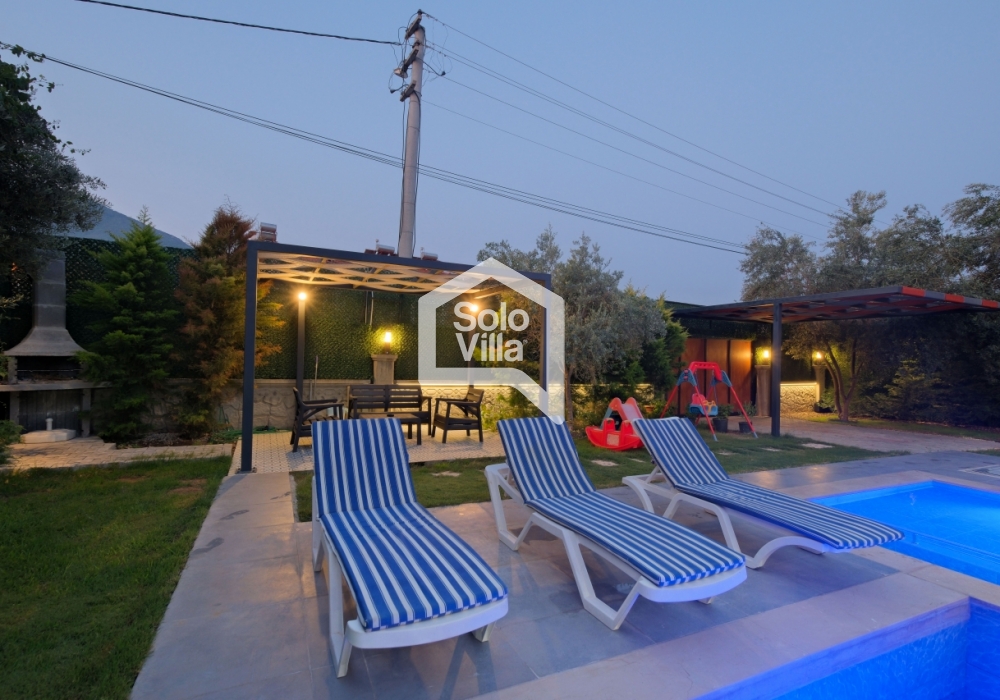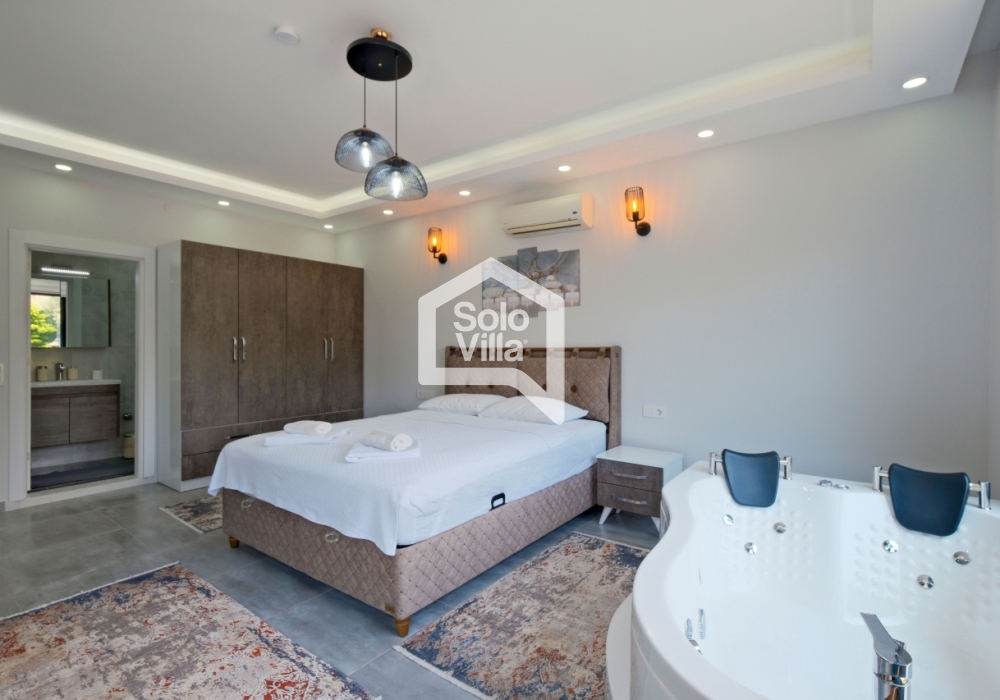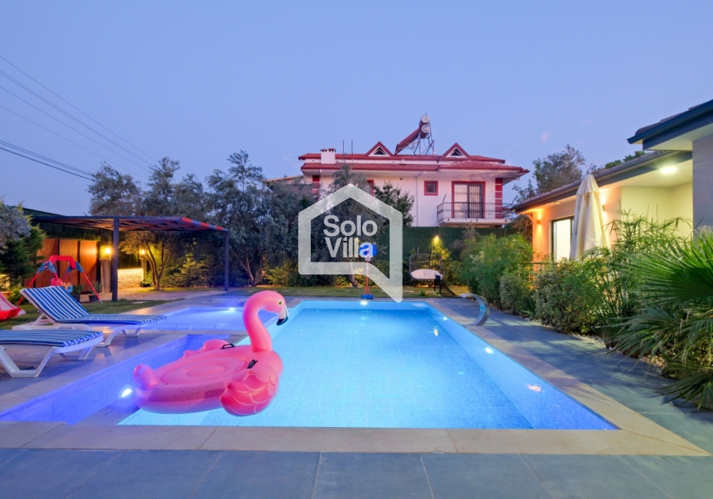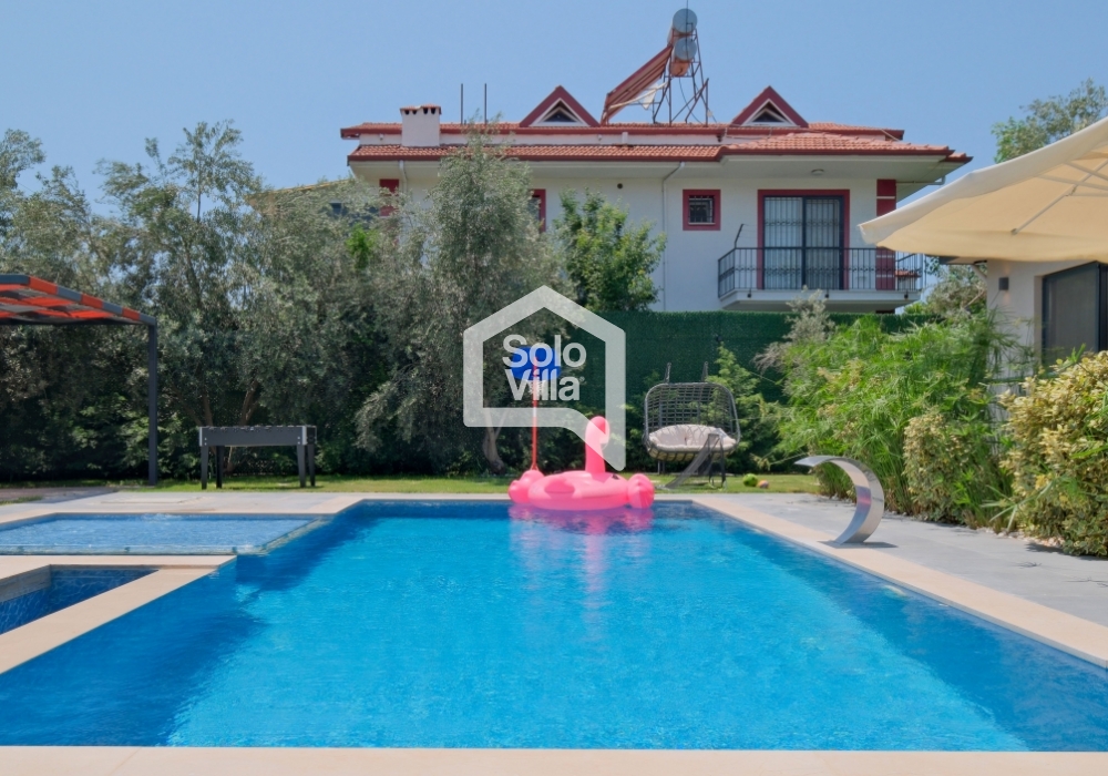 Located in a serene, nature-filled area of Fethiye, Villa Solo Tanus offers 2 bedrooms and accommodation for up to 4 guests, making it perfect for families and small groups. Enjoy the private pool, children’s pool, and garden entertainment areas (table tennis, foosball, air hockey) for a fun-filled holiday. The master bedroom jacuzzi and sauna, along with a modern kitchen and spacious living areas, combine comfort and luxury.