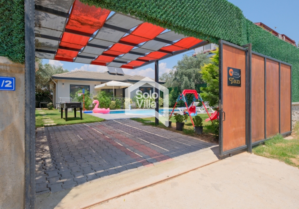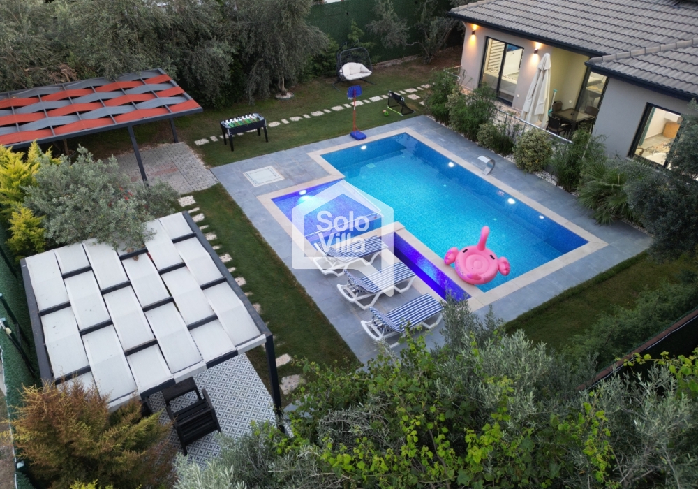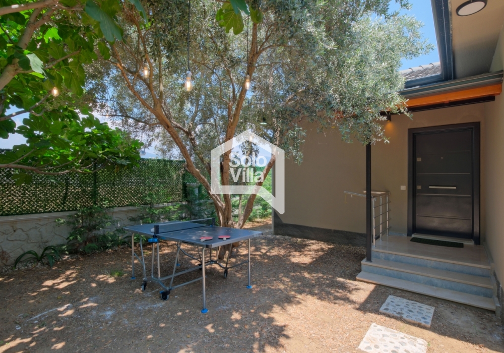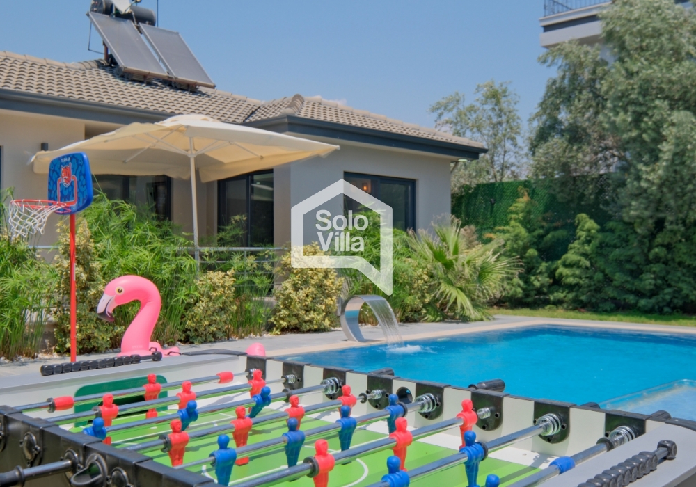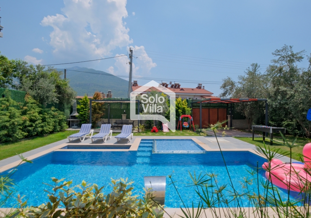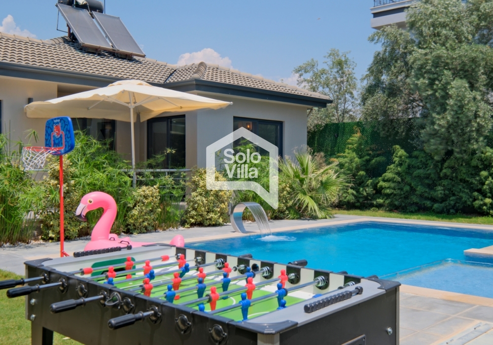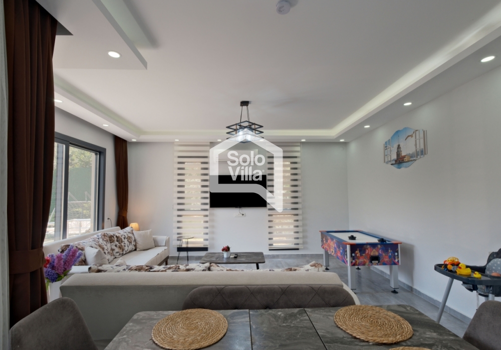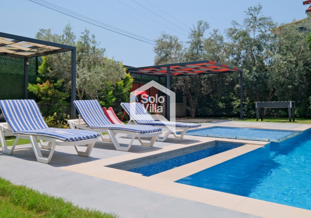 Located in a serene, nature-filled area of Fethiye, Villa Solo Tanus offers 2 bedrooms and accommodation for up to 4 guests, making it perfect for families and small groups. Enjoy the private pool, children’s pool, and garden entertainment areas (table tennis, foosball, air hockey) for a fun-filled holiday. The master bedroom jacuzzi and sauna, along with a modern kitchen and spacious living areas, combine comfort and luxury.