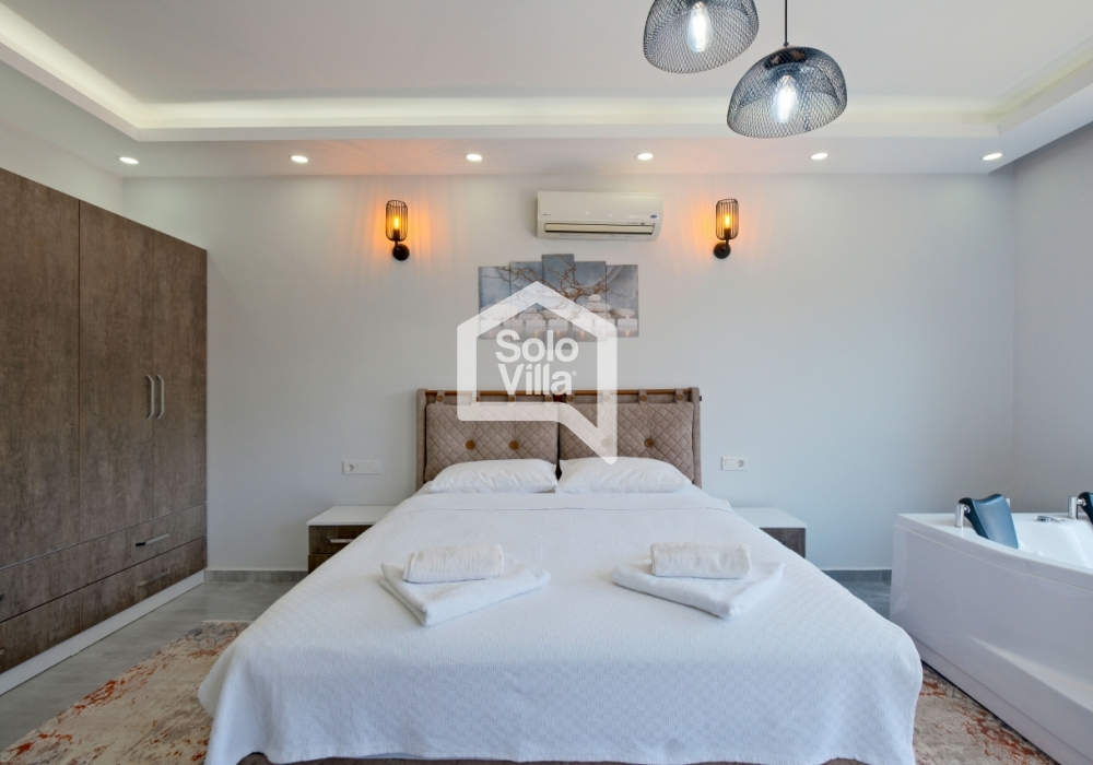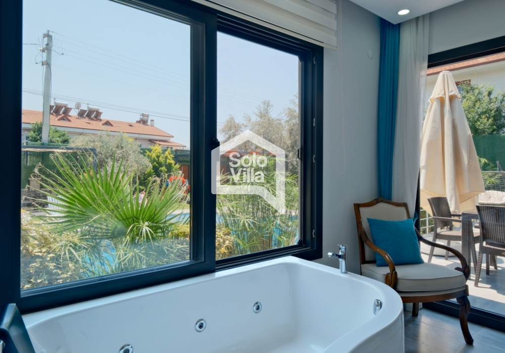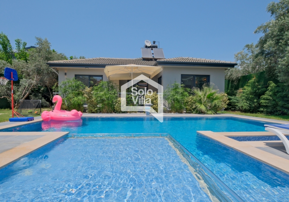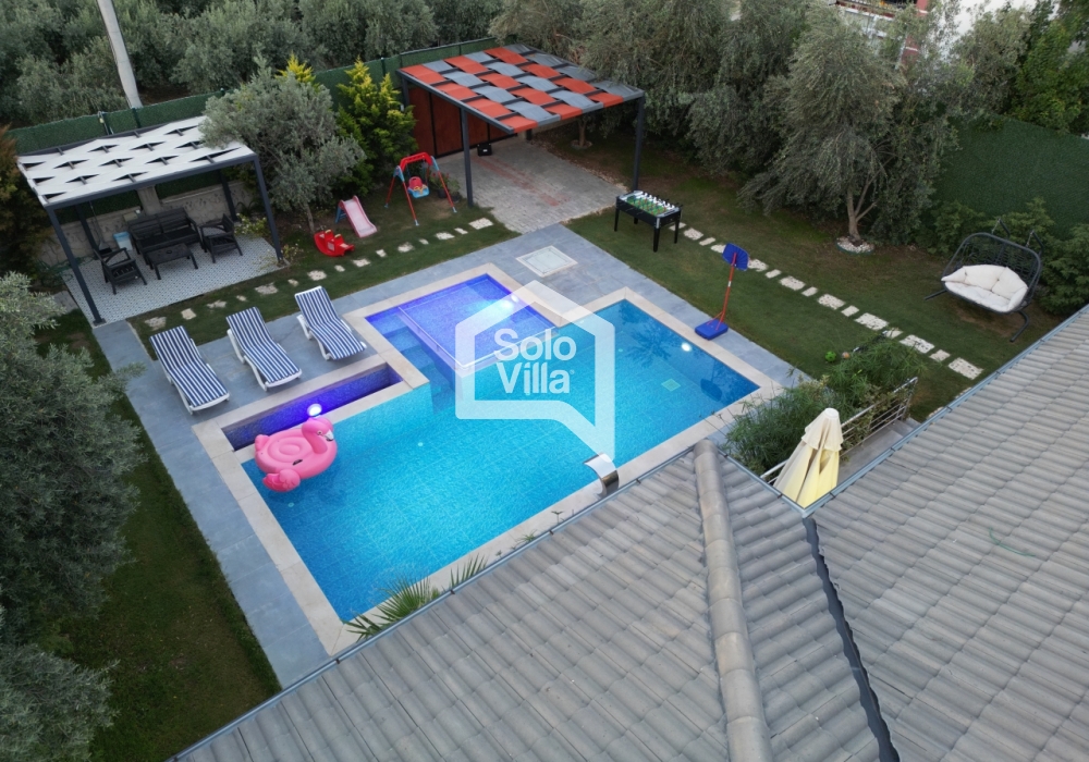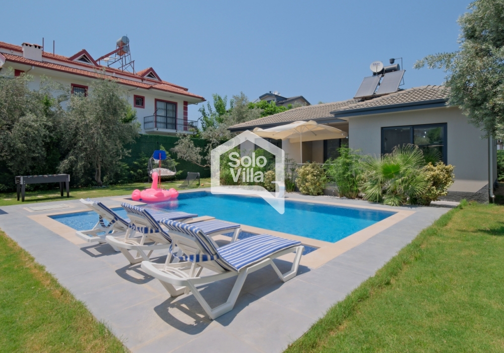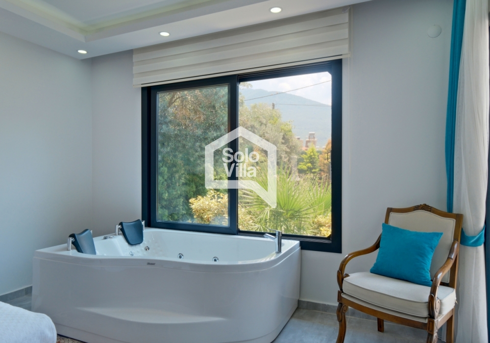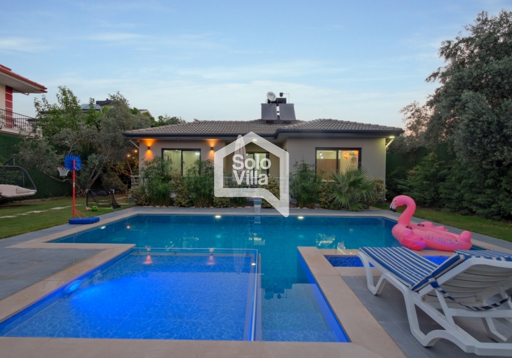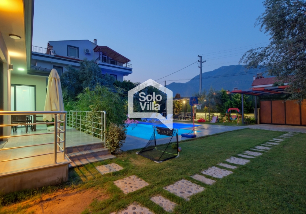 Located in a serene, nature-filled area of Fethiye, Villa Solo Tanus offers 2 bedrooms and accommodation for up to 4 guests, making it perfect for families and small groups. Enjoy the private pool, children’s pool, and garden entertainment areas (table tennis, foosball, air hockey) for a fun-filled holiday. The master bedroom jacuzzi and sauna, along with a modern kitchen and spacious living areas, combine comfort and luxury.