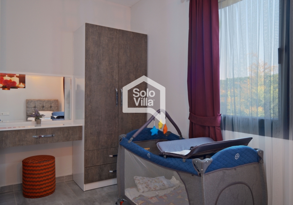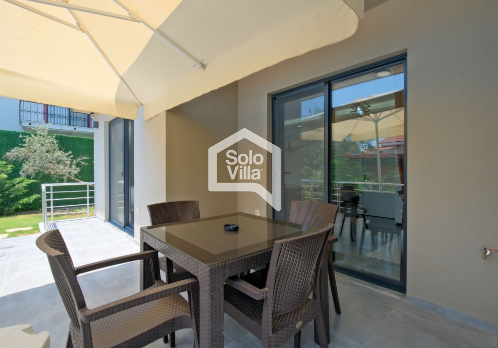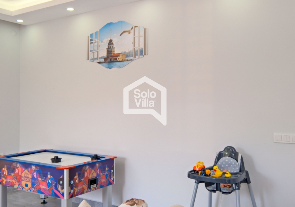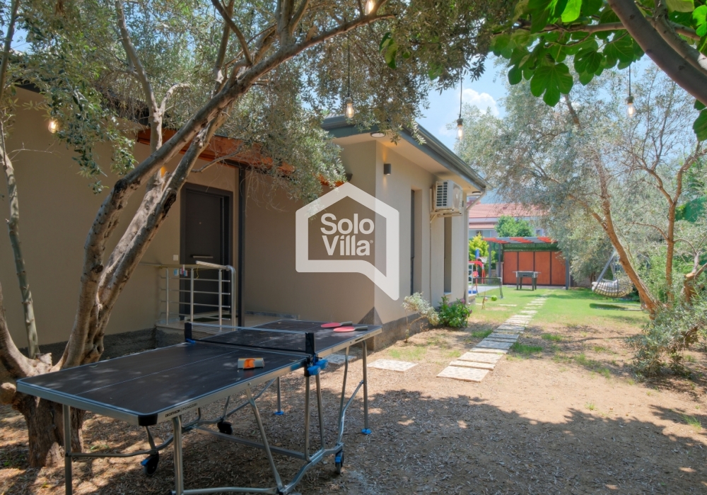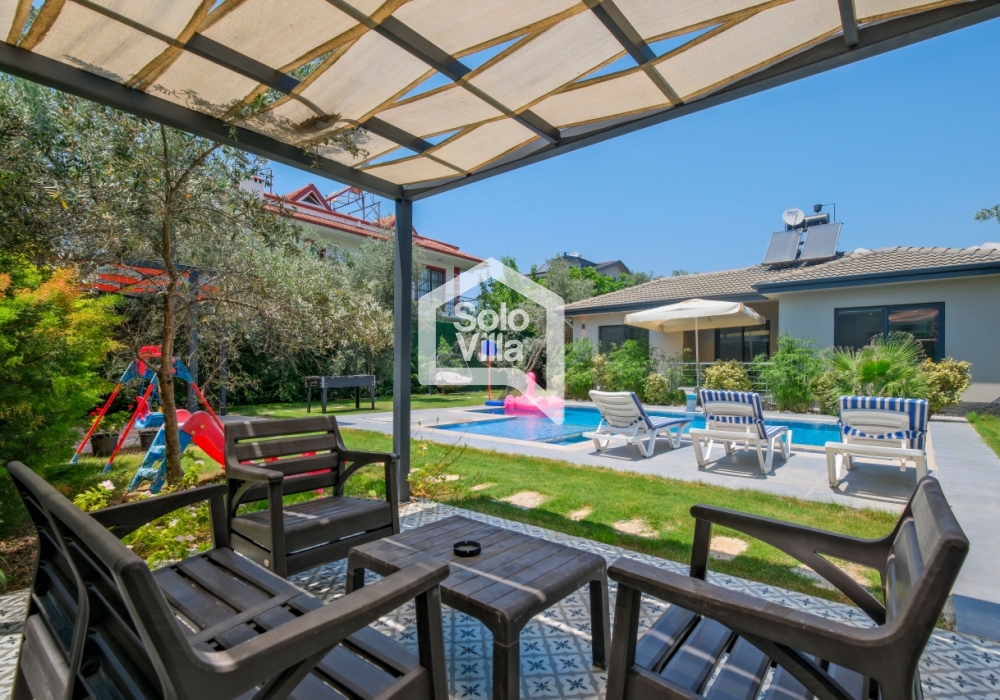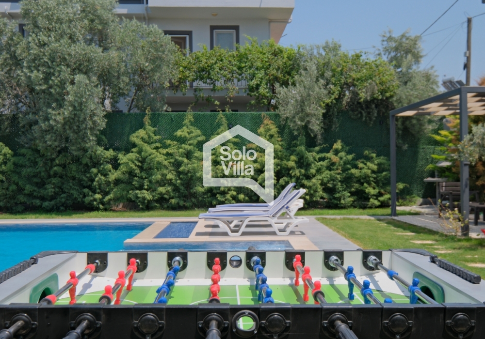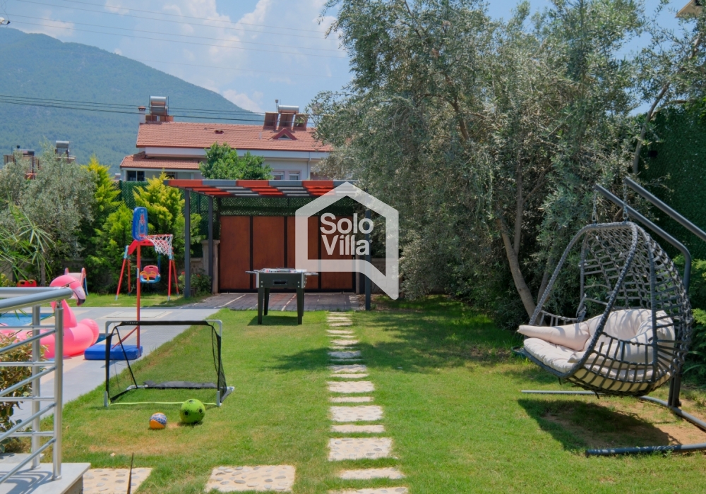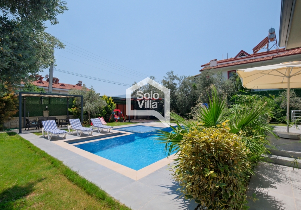 Located in a serene, nature-filled area of Fethiye, Villa Solo Tanus offers 2 bedrooms and accommodation for up to 4 guests, making it perfect for families and small groups. Enjoy the private pool, children’s pool, and garden entertainment areas (table tennis, foosball, air hockey) for a fun-filled holiday. The master bedroom jacuzzi and sauna, along with a modern kitchen and spacious living areas, combine comfort and luxury.