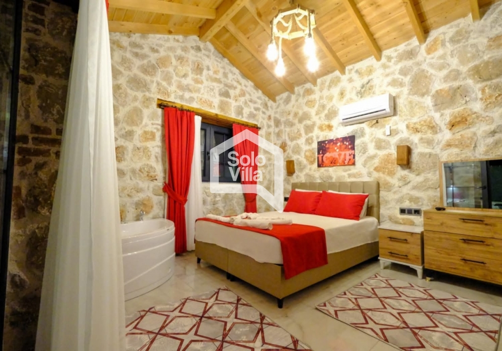La villa cuenta con 2 dormitorios. El dormitorio principal dispone de cama doble, baño privado y jacuzzi, mientras que el segundo dormitorio tiene dos camas individuales. Además, una persona puede alojarse en el sofá del salón, con una capacidad total de hasta 5 huéspedes.