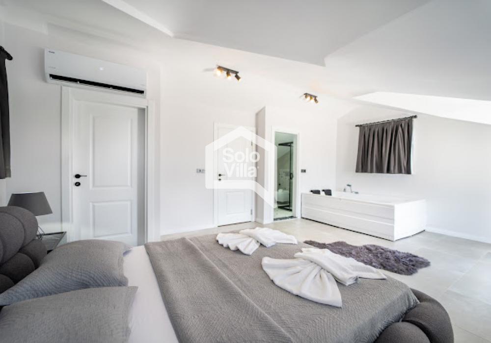 La villa cuenta con 3 dormitorios. El dormitorio principal dispone de cama doble, baño privado, aire acondicionado y jacuzzi. El segundo dormitorio tiene cama doble, aire acondicionado y baño privado, mientras que el tercero cuenta con dos camas individuales, aire acondicionado y baño privado.