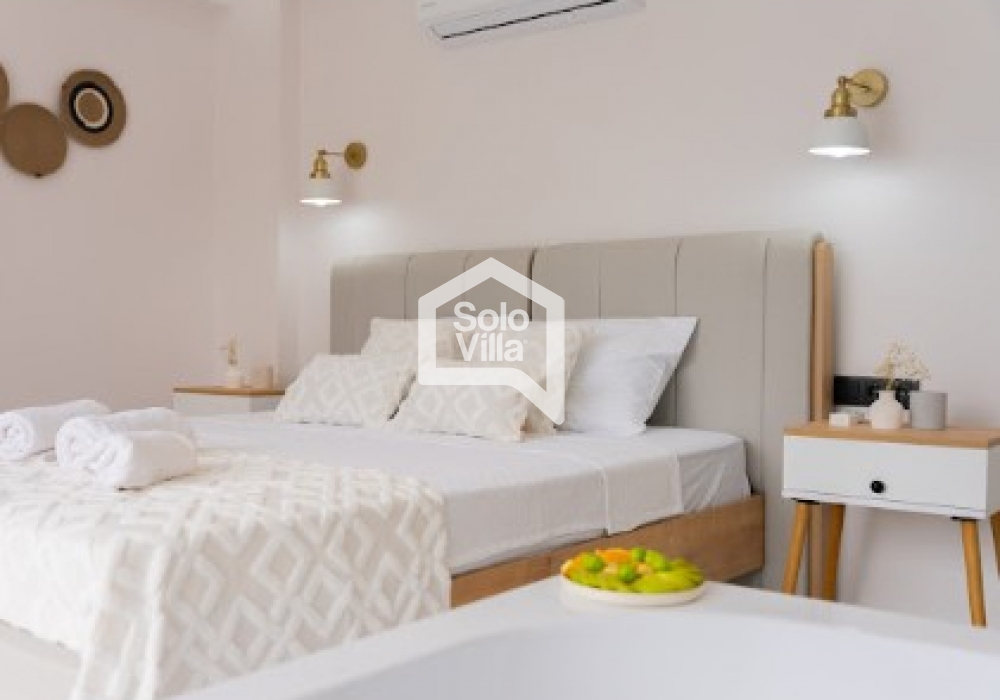 1 cama doble, mesita de noche, aire acondicionado, armario, jacuzzi, baño privado y acceso directo a la terraza de la piscina.