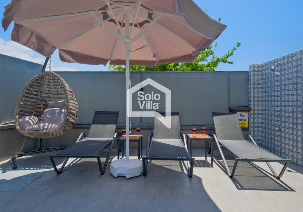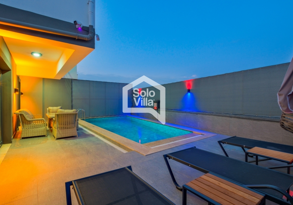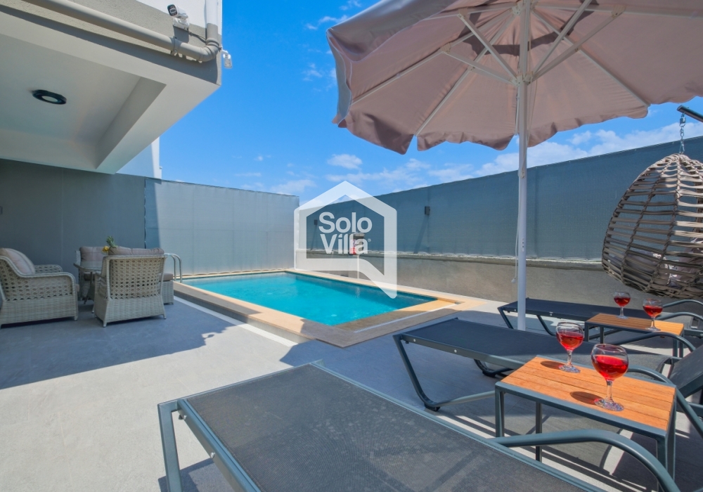 Piscina: Nuestra villa dispone de una piscina privada de 3x7 metros y 150 cm de profundidad. El mantenimiento de la piscina y del jardín se realiza cada dos días, por la mañana o por la tarde. Hay tumbonas junto a la piscina y una zona de relajación y columpios en el jardín.