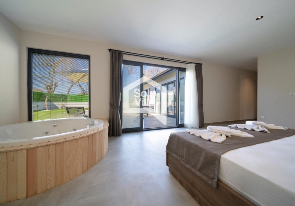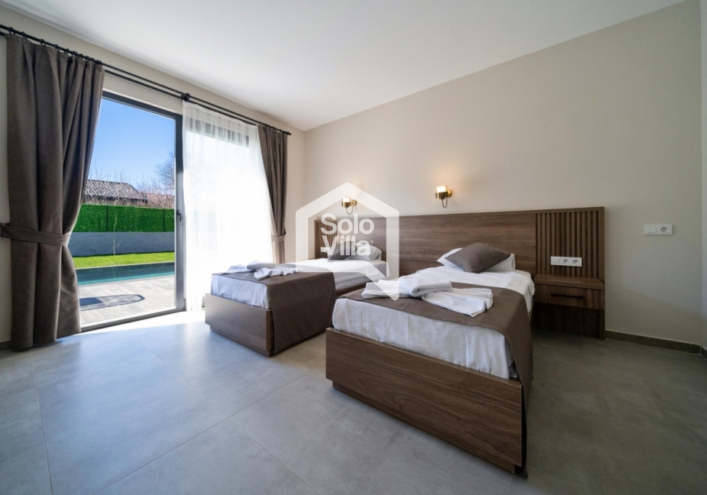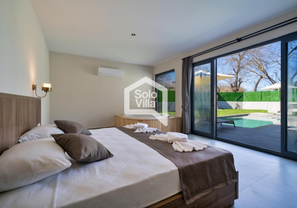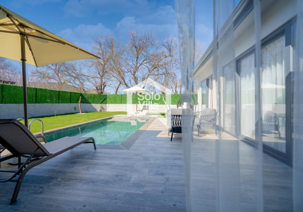 L'intérieur et l'extérieur de la villa sont de conception très moderne et la piscine est abritée. C'est le bon choix pour nos clients qui apprécient leur vie privée. Avec le jacuzzi de la chambre parentale, vous pourrez goûter aux plaisirs qui vous attendent toute l'année, accompagnés de la vue sur la nature.
